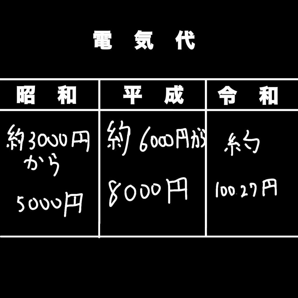 上の画像の通りのおおよその昭和、平成、令和の電気代です
